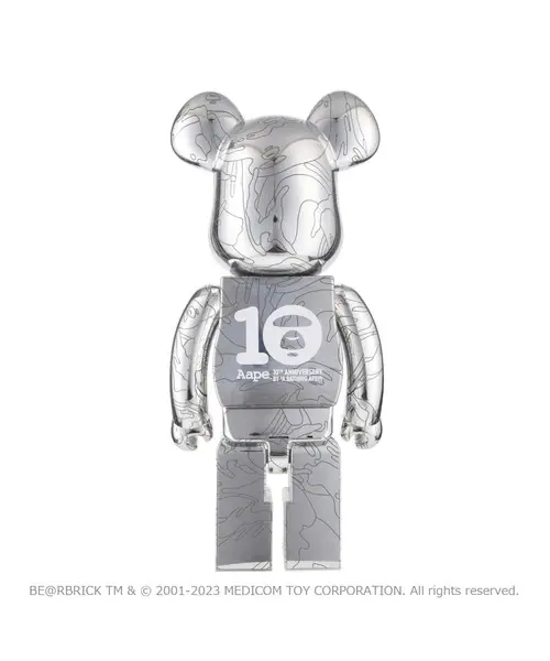 *BE@RBRICK x AAPE BY A BATHING APE 10th Anniversary Set (100% & 400%) es una edición especial creada para celebrar el 10º aniversario de AAPE, la línea contemporánea de A Bathing Ape. Para esta ocasión, AAPE vuelve a unir fuerzas con Medicom Toy, dando como resultado una pieza altamente coleccionable dentro del universo BE@RBRICK.