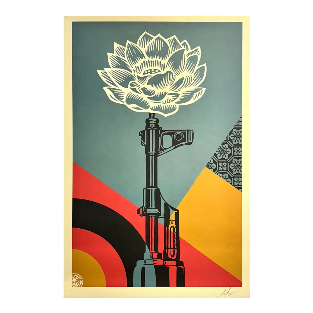 Fairey utiliza su característico lenguaje gráfico —donde conviven la propaganda, el simbolismo floral y la composición equilibrada— para resignificar las armas como metáforas de resistencia pacífica. Cada impresión propone una meditación sobre el poder de la belleza frente a la violencia y la capacidad del arte para subvertir los símbolos de opresión.