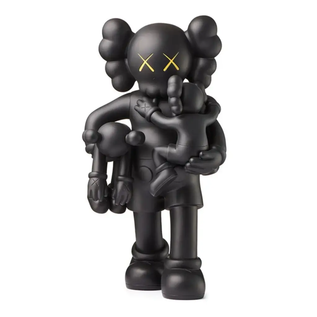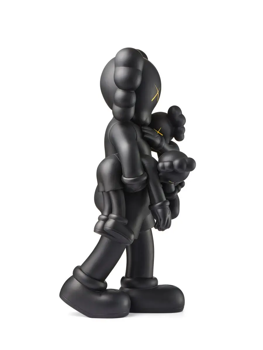Edición en vinilo negro de CLEAN SLATE (2018), donde KAWS representa a su emblemático Companion cargando dos figuras pequeñas, una reflexión sobre el tiempo, la responsabilidad y la ternura dentro de su lenguaje pop contemporáneo.