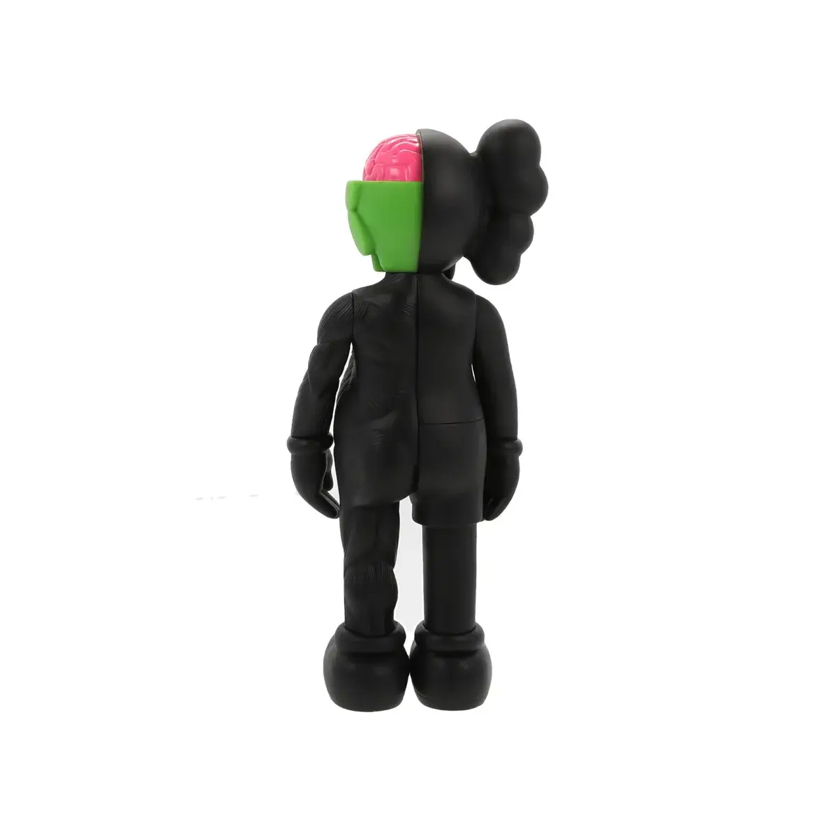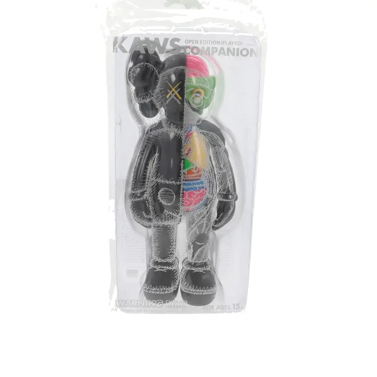 Esta edición Flayed revela el interior anatómico estilizado del personaje, una característica distintiva dentro del lenguaje visual de KAWS. La mitad del cuerpo expone órganos y estructuras en colores neón, mientras que el exterior mantiene un acabado sólido en negro, creando un contraste visual que resalta el concepto de disección artística que el artista ha explorado en múltiples obras.