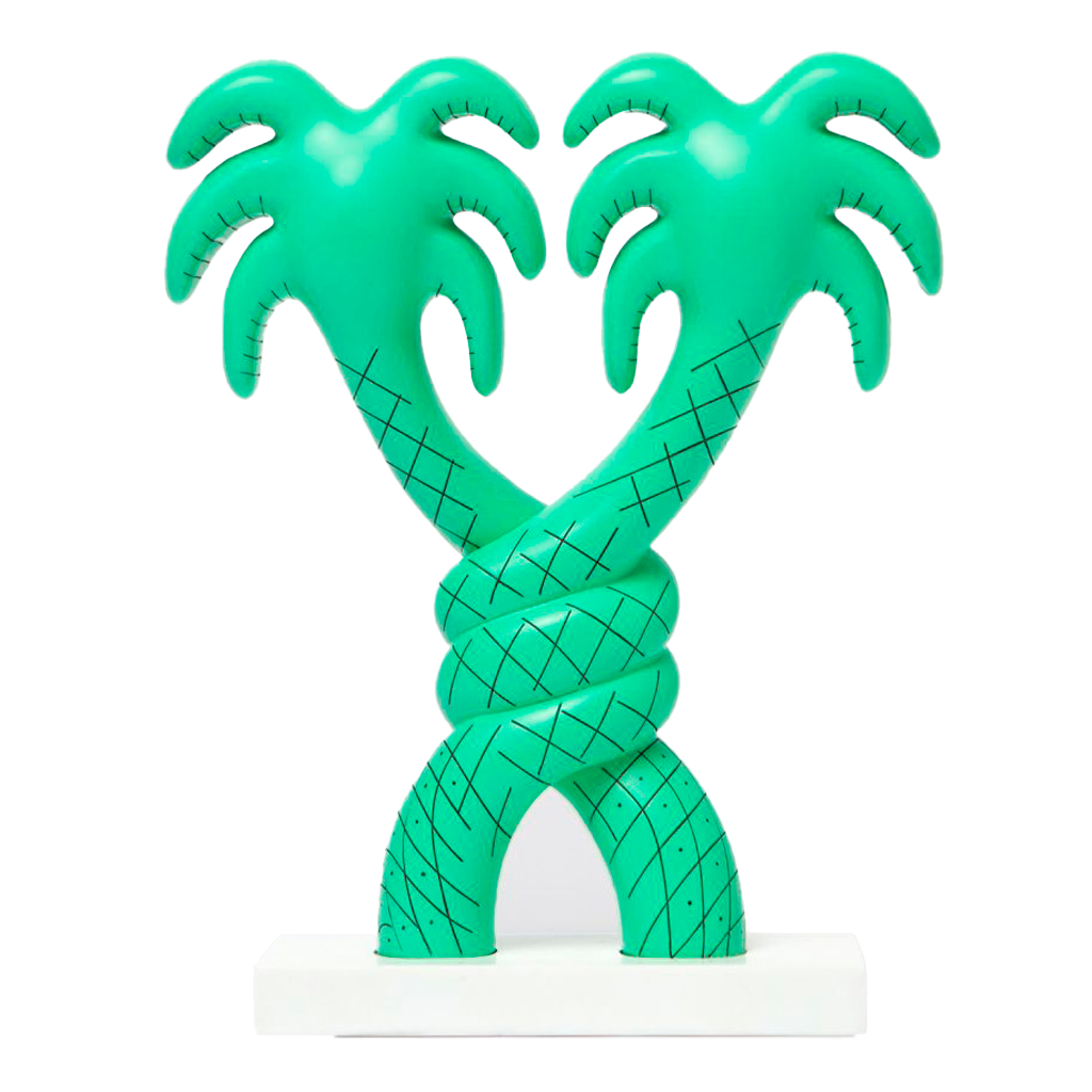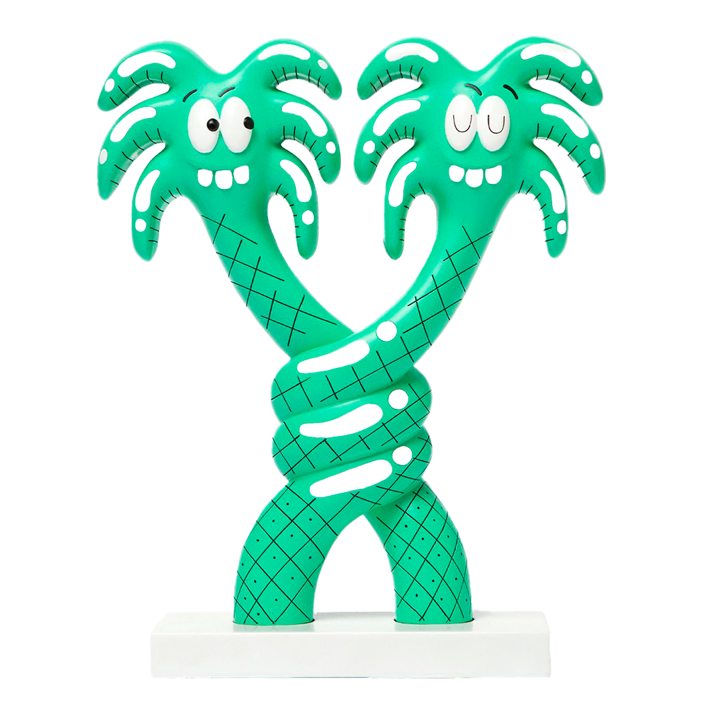 La pieza presenta a dos de sus icónicas palmeras entrelazadas, un motivo recurrente en la obra del artista que representa tanto el dinamismo de la naturaleza como la energía vibrante de la vida urbana californiana. Con su estilo lleno de color, formas orgánicas y un toque surrealista, Hello Mello refleja la fusión entre arte contemporáneo y diseño que ha convertido a Harrington en uno de los referentes del pop-psychedelic californiano.