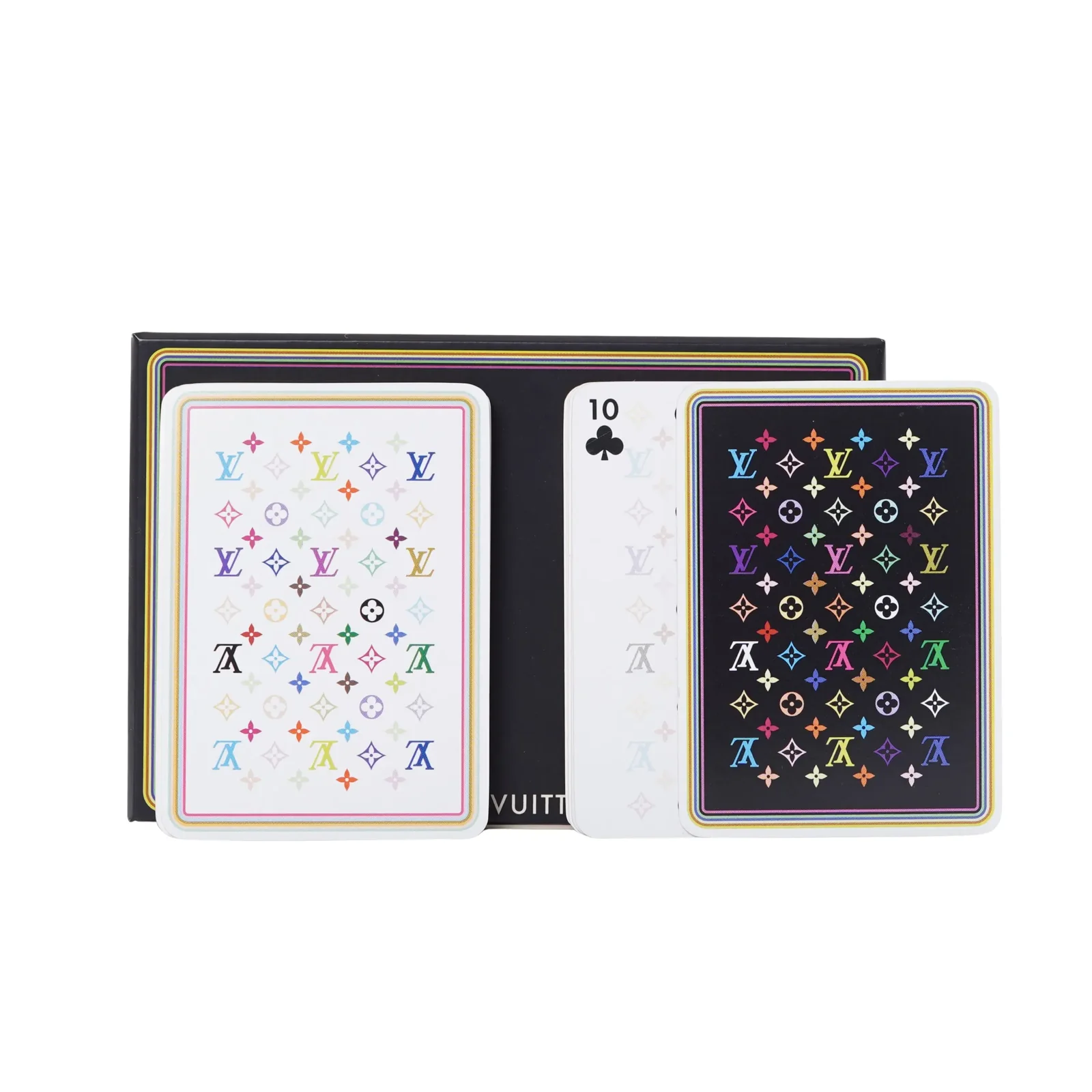 El conjunto incluye dos barajas completas, cada una con un diseño único. Una con reverso Multicolore sobre fondo negro. Otra con reverso Multicolore sobre fondo blanco