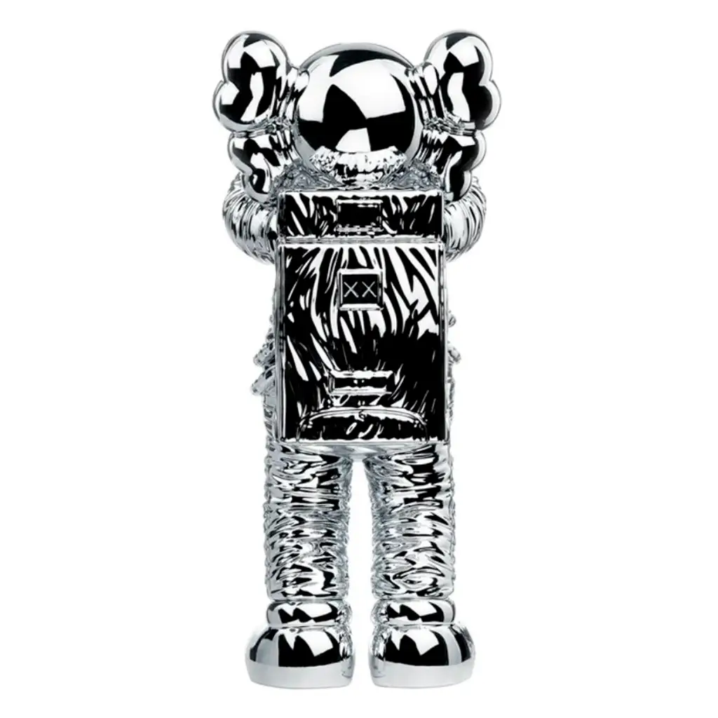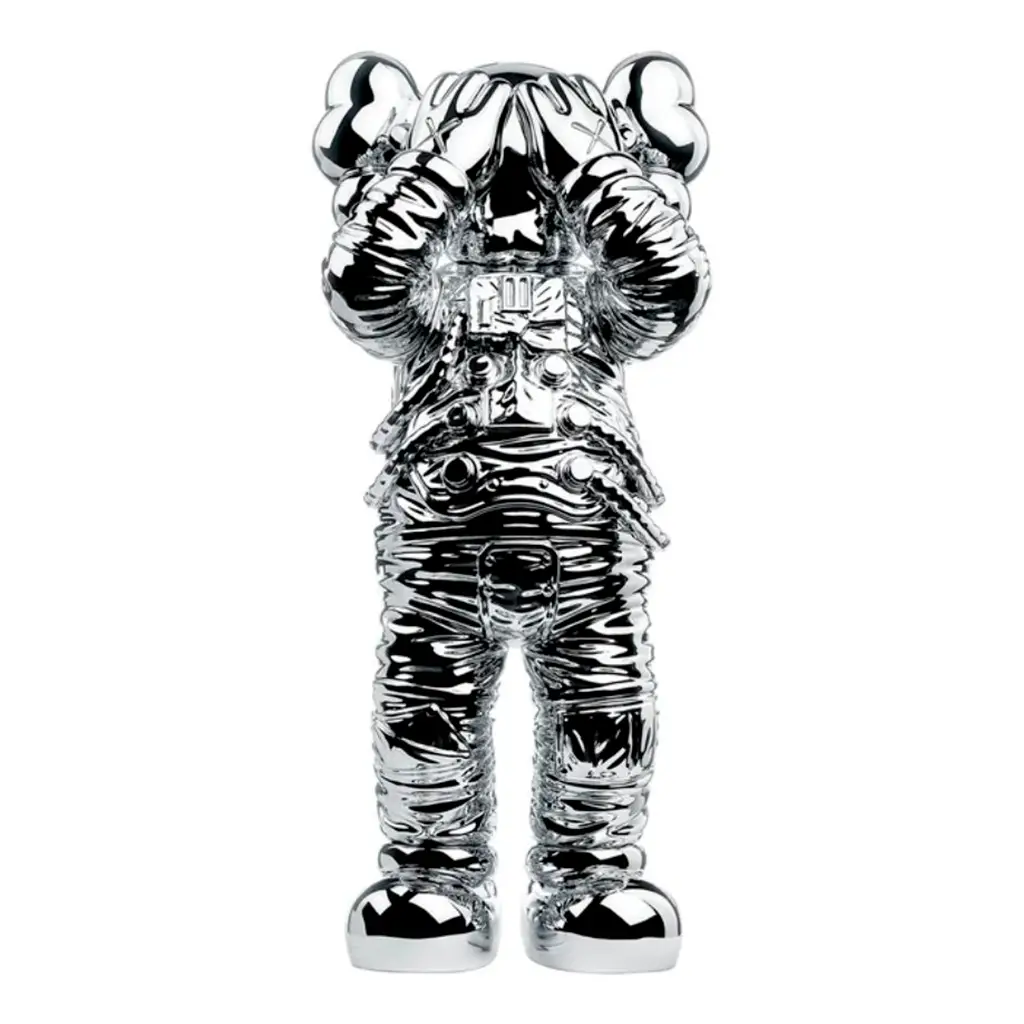 Inspirada en el famoso Moonman Trophy de los MTV VMA (2013), la figura muestra un Companion con traje espacial completo, detallado con válvulas, mangueras y acabados técnicos, todo envuelto en un brillante acabado plateado metálico. A diferencia de los vinilos tradicionales de KAWS, esta escultura se distingue por su cuerpo más sólido y pesado, lo que la convierte en una pieza de exhibición imponente.