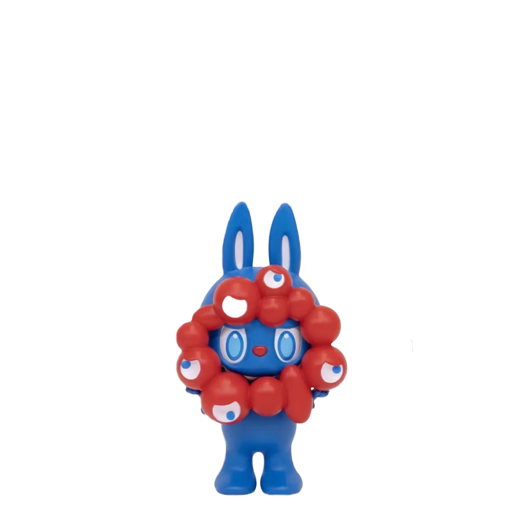 MYAKU-MYAKU, descrito como una criatura misteriosa formada por células rojas y agua azul, es conocido por los múltiples globos oculares que rodean su boca. Este rasgo distintivo se traslada directamente a la figura, incluyendo un ojo rojo adicional en la cola de Labubu, reforzando el carácter surrealista y orgánico del diseño.