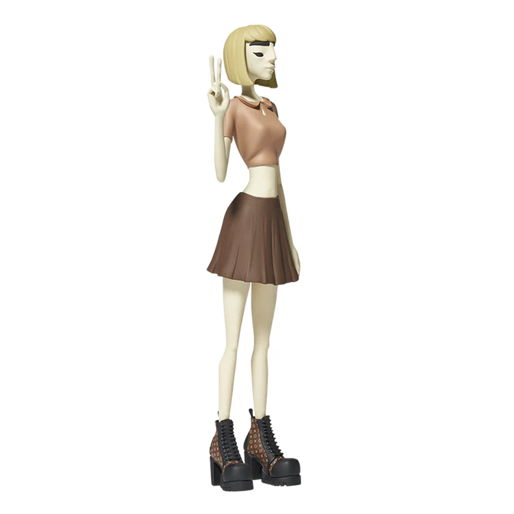 Eva se luce con un outfit que mezcla sensualidad y actitud: blusa ajustada, falda plisada y unas combat boots de alta costura con patrones inspirados en un legendario sello de lujo. Todo en proporciones estilizadas que refuerzan su carácter fashionista y rebelde.