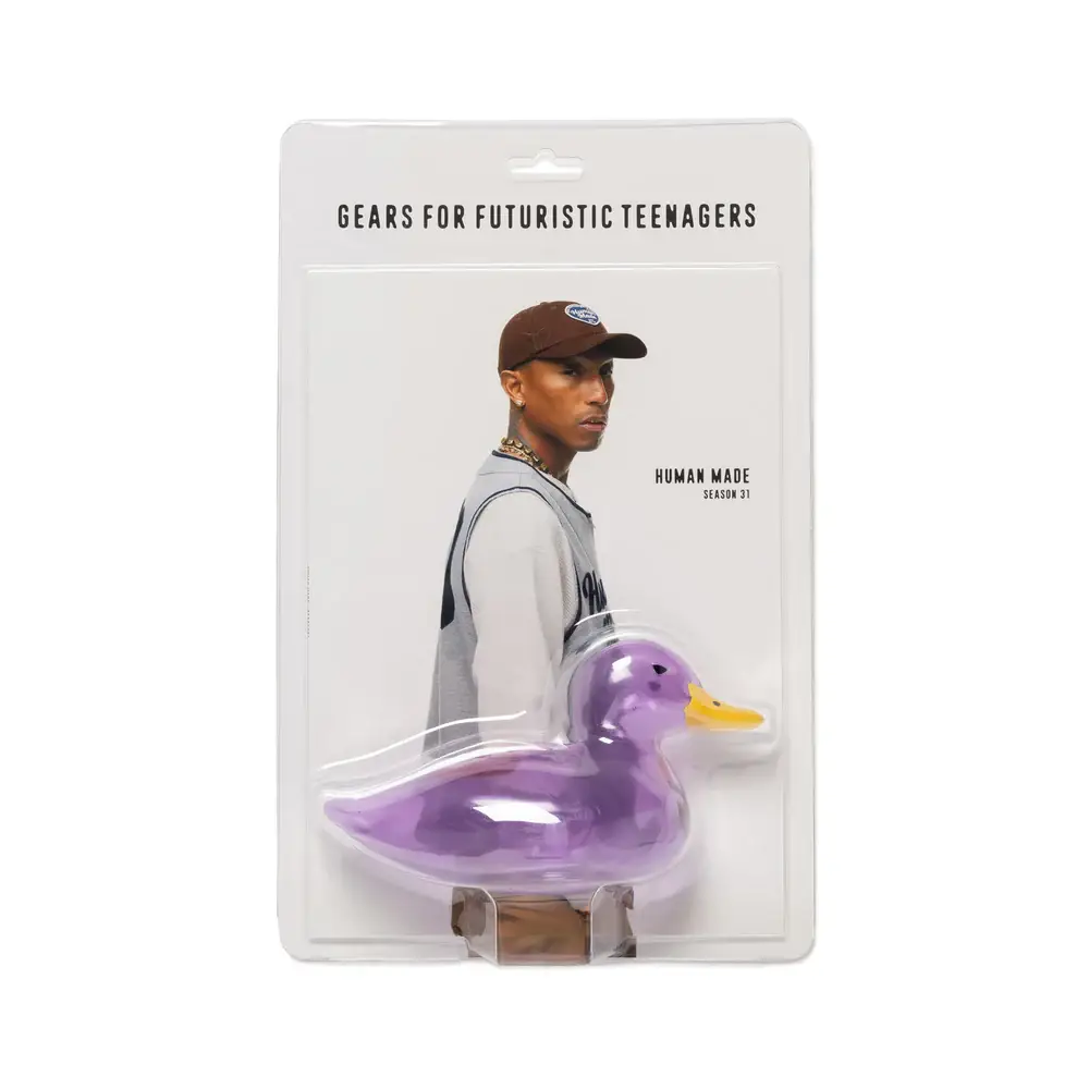 Incluido en un lookbook de 30 páginas que adelanta lanzamientos clave de 2026 y presenta un shooting protagonizado por Pharrell Williams, el pato de hule morado se presenta en blister pack, reforzando su carácter de objeto de archivo y colección. Su estética simple pero cargada de identidad conecta con la filosofía de HUMAN MADE: reinterpretar iconos clásicos a través de una visión moderna y cuidada.