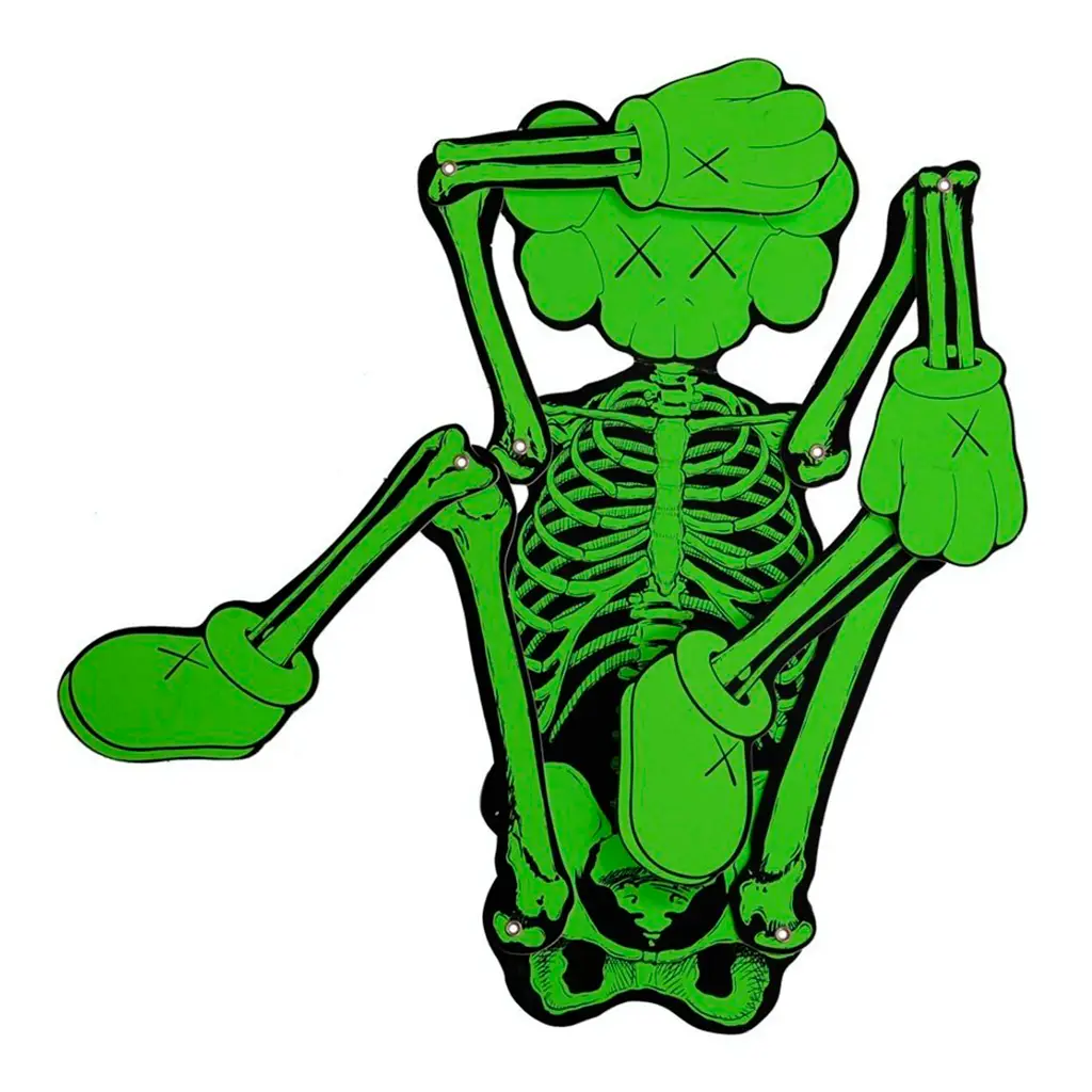 En esta edición limitada de 2021, KAWS reinterpreta su icónico diseño Skeleton Board originalmente lanzado por OriginalFake en 2007. La pieza, realizada en serigrafía a color sobre cartulina, presenta un tablero con recortes de huesos que fusiona el humor gráfico y la estética pop del artista. Con su característico lenguaje visual, KAWS transforma un objeto cotidiano en una obra de arte coleccionable. Esta versión en verde conserva su embalaje original
