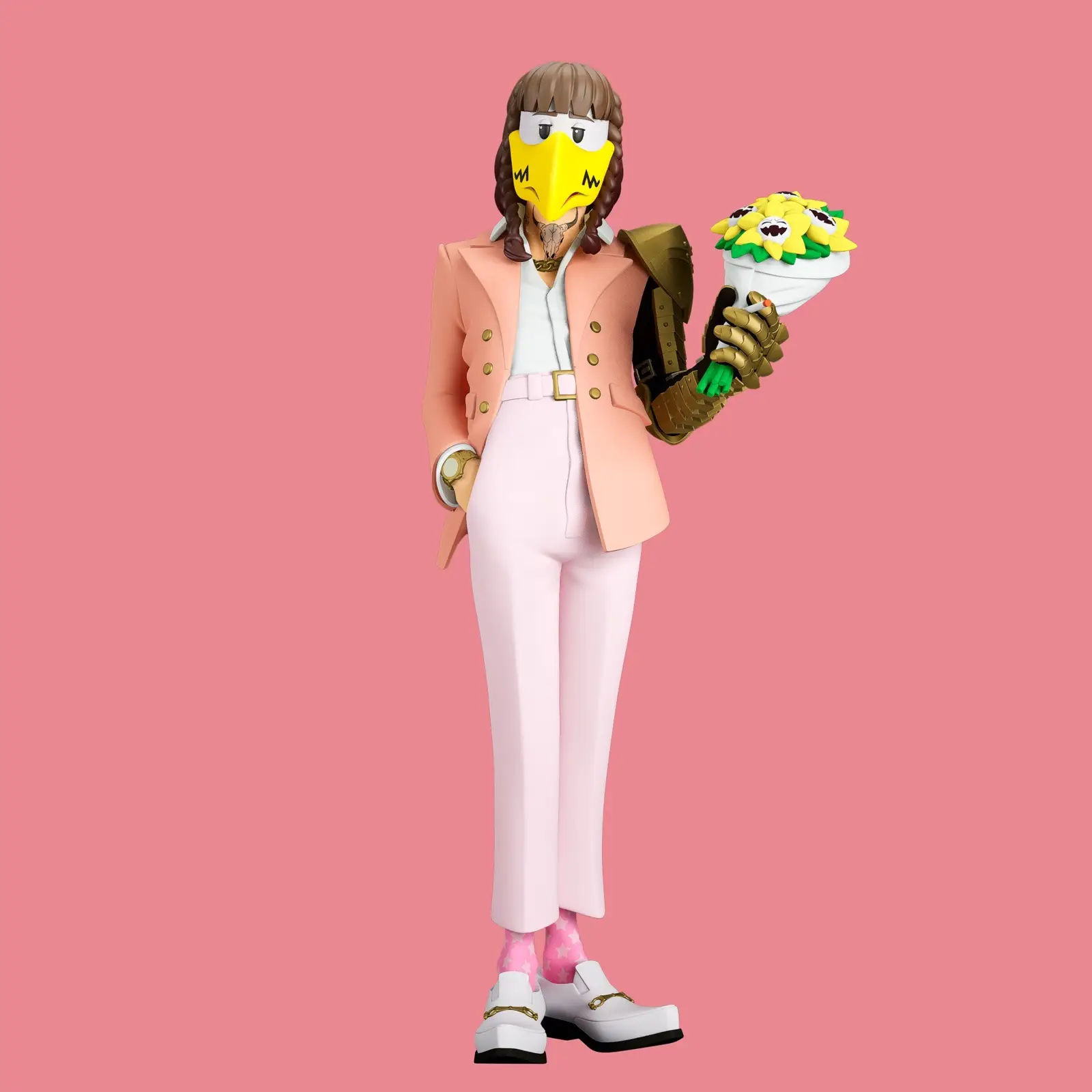 El diseño incorpora referencias directas a los alter egos de Post Malone, con tatuajes meticulosamente representados en el rostro, cuello y manos. Rindiendo homenaje al videoclip “Rockstar”, el personaje sostiene una espada samurái dorada que se ajusta perfectamente al brazo de la chaqueta. Además, el brazo intercambiable con armadura hace eco de su caracterización como caballero en “Circles”, acompañado por un ramo de flores diseñado específicamente para esa extremidad. Ambos accesorios están diseñados de forma exclusiva para cada brazo sin posibilidad de intercambiarse entre ellos.