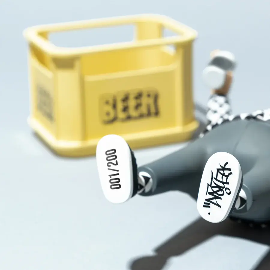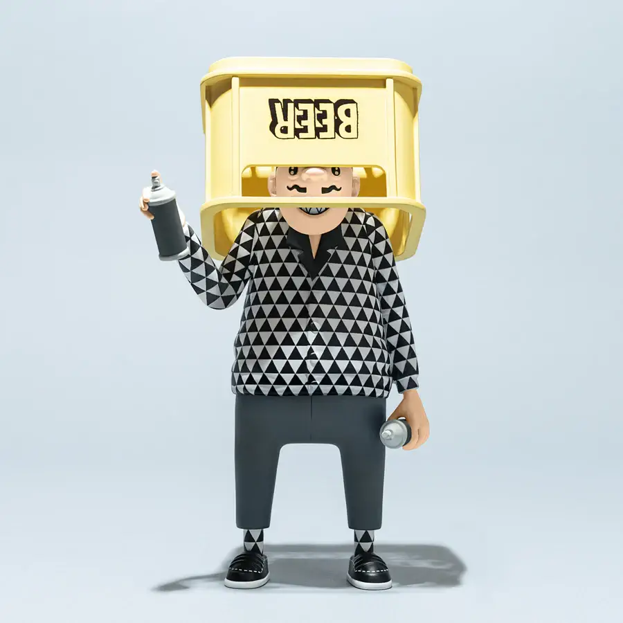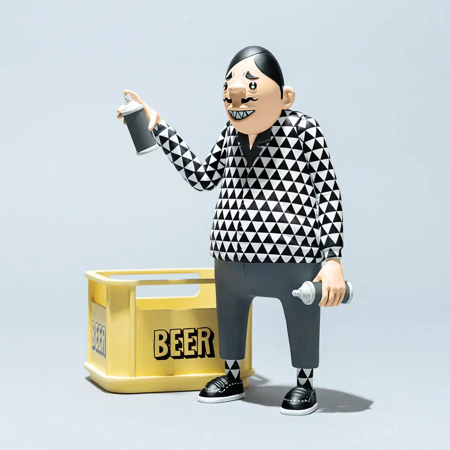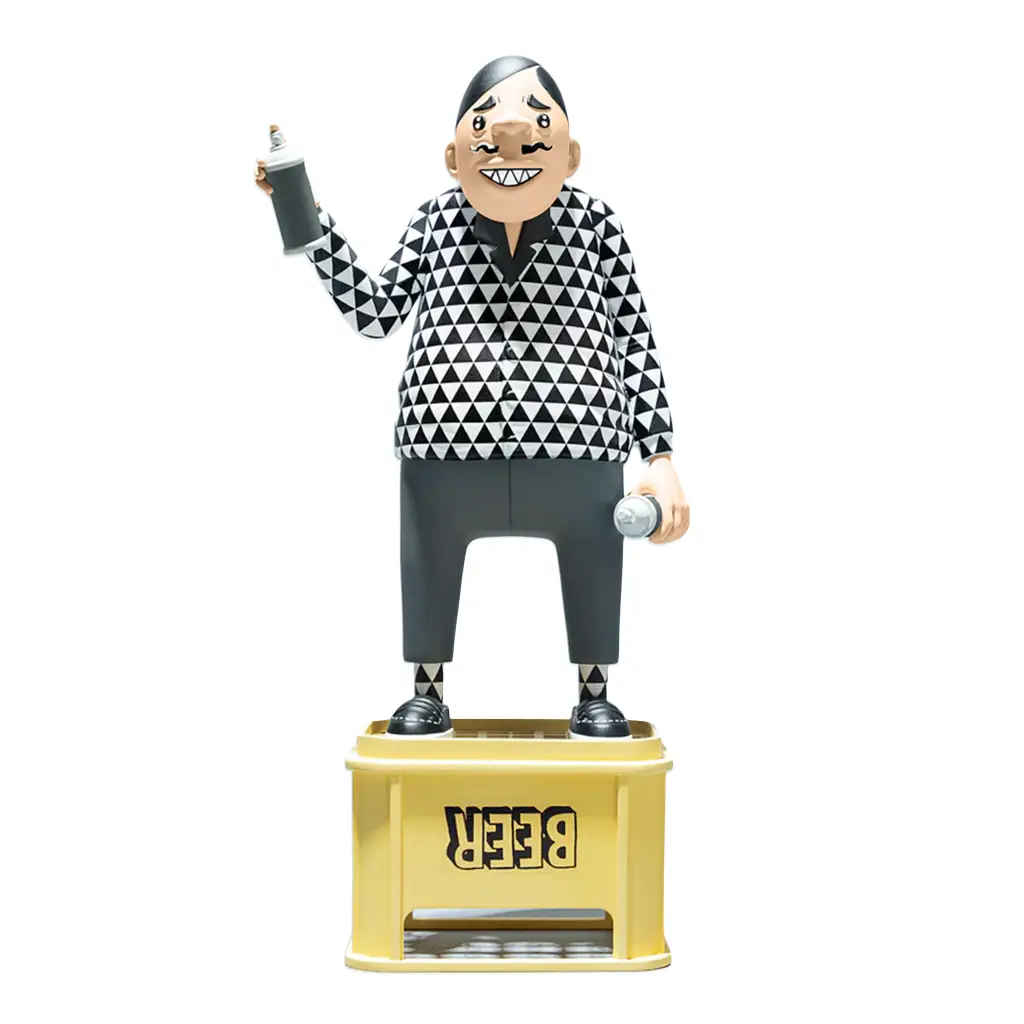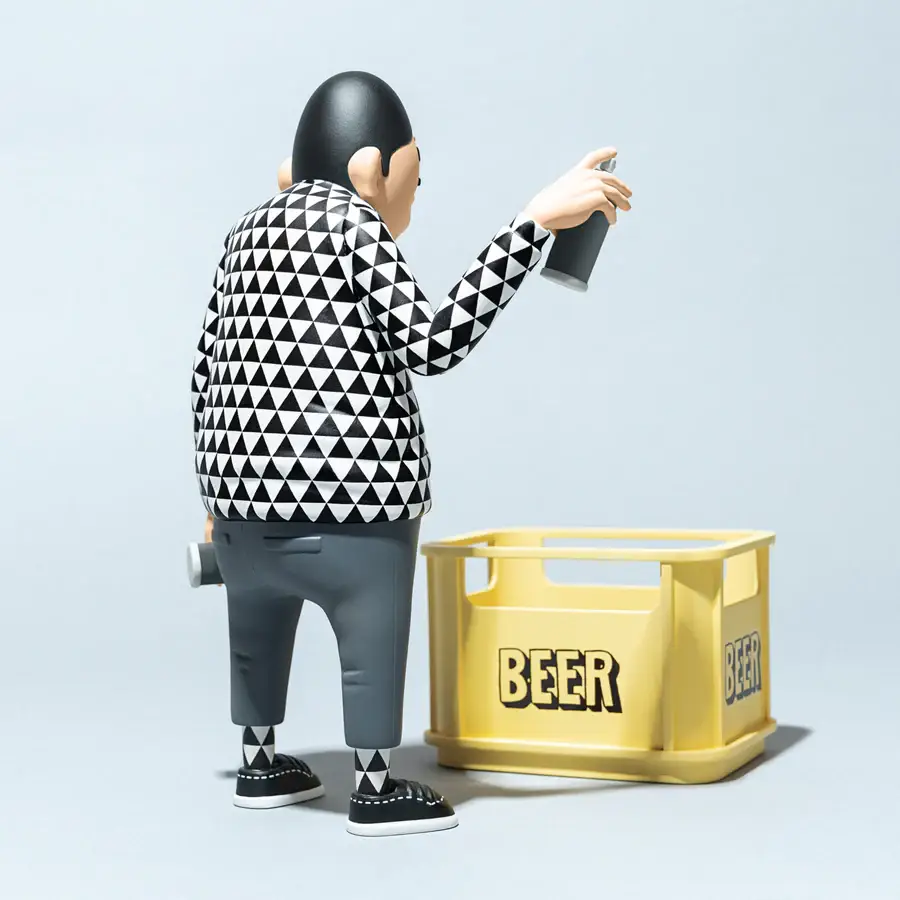 Vestido con un impecable conjunto en blanco y negro con patrones geométricos, el personaje refleja la estética característica de ESOW, profundamente influenciada por la cultura urbana japonesa y el street art. Detalles como los tags y las cajas de cerveza vacías aportan una narrativa visual cargada de personalidad, evocando escenas cotidianas con un giro artístico.